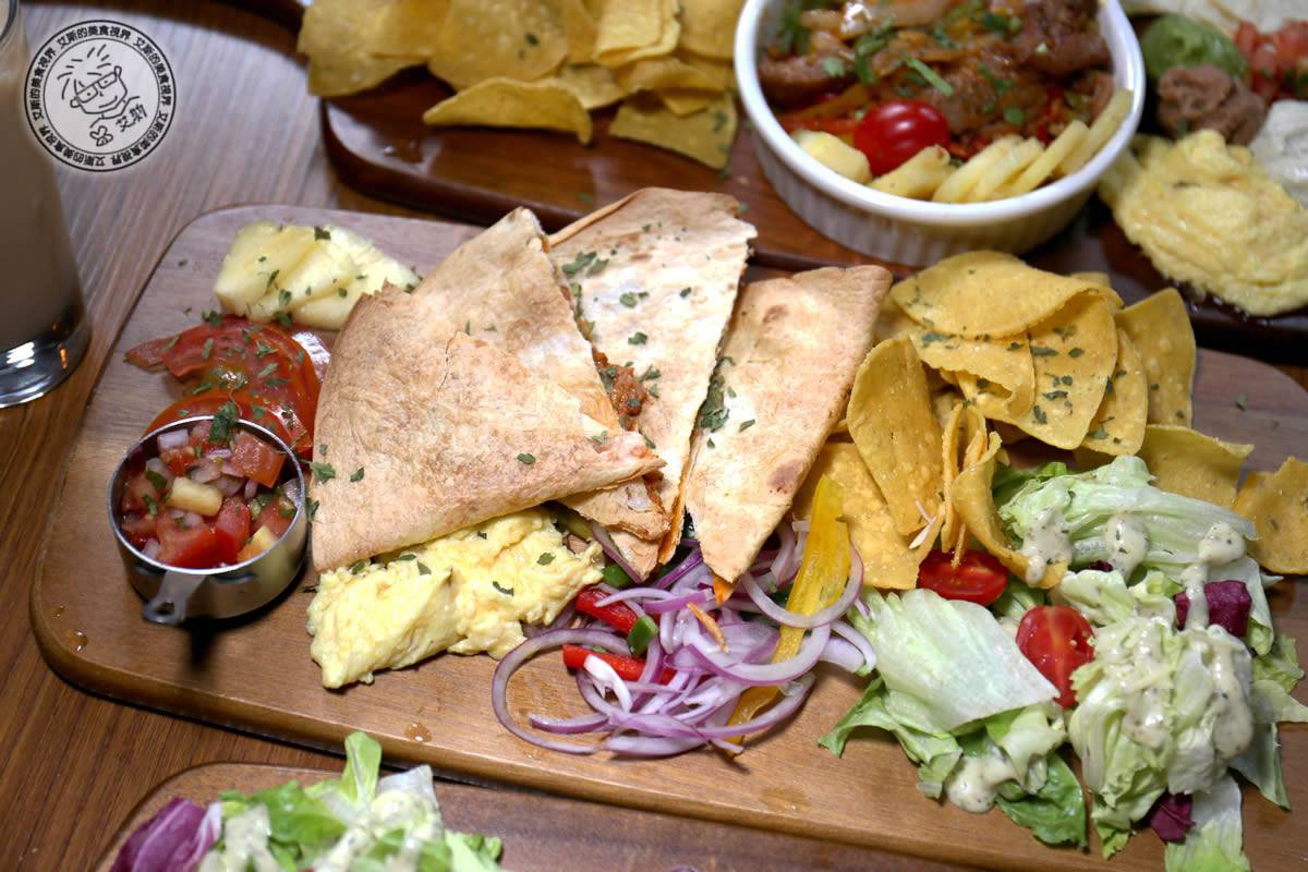 墨西哥絞肉卡莎蒂亞(配有炒蛋、玉米片、莎莎醬、凱薩沙拉)