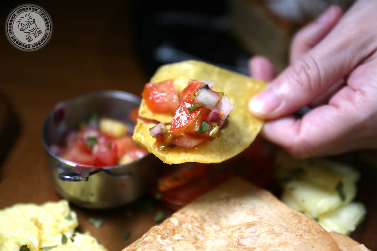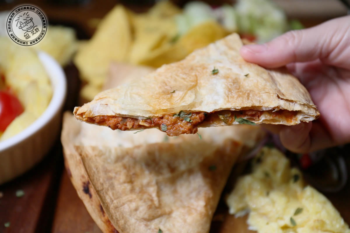 餅皮煎得微酥,咬下去先是香脆,再來是熱呼呼的絞肉香。內餡加入葡萄乾,甜甜鹹鹹的味道很有記憶點,起司一拉又有披薩感。旁邊配炒蛋、玉米片、莎莎醬與凱薩沙拉,可以自己搭配吃法:莎莎醬酸辣很解膩,玉米片增脆度,凱薩沙拉則當清爽緩衝。