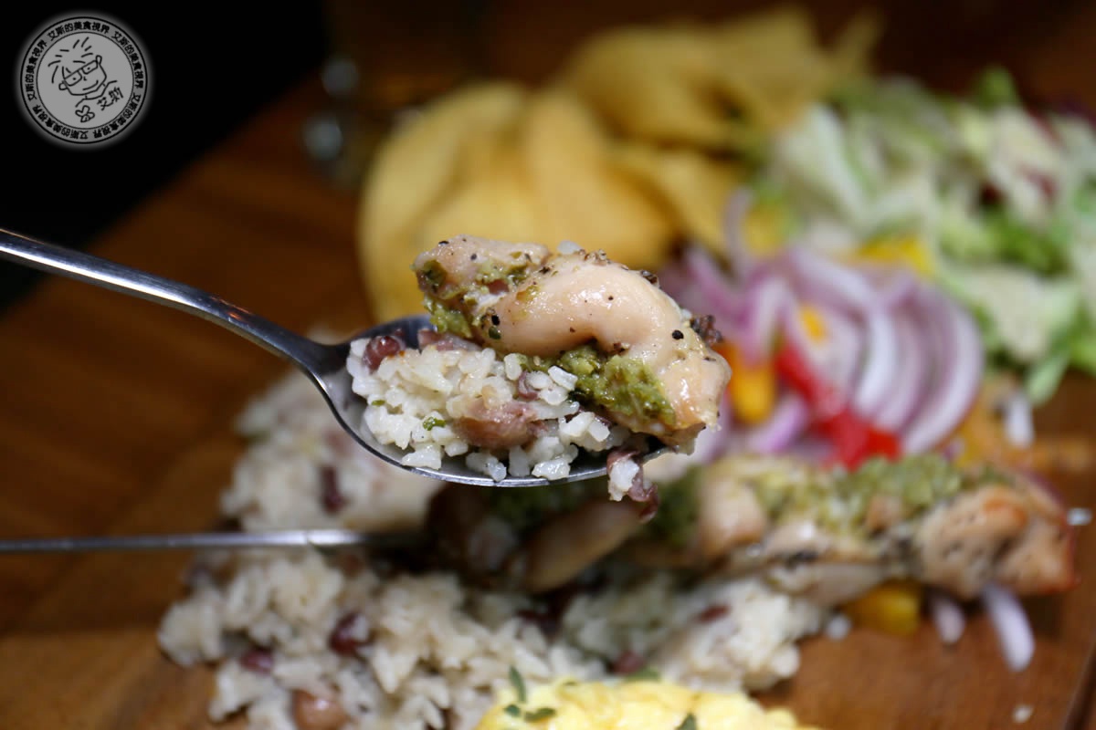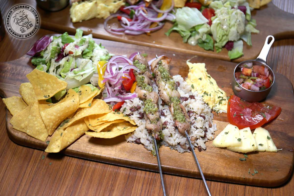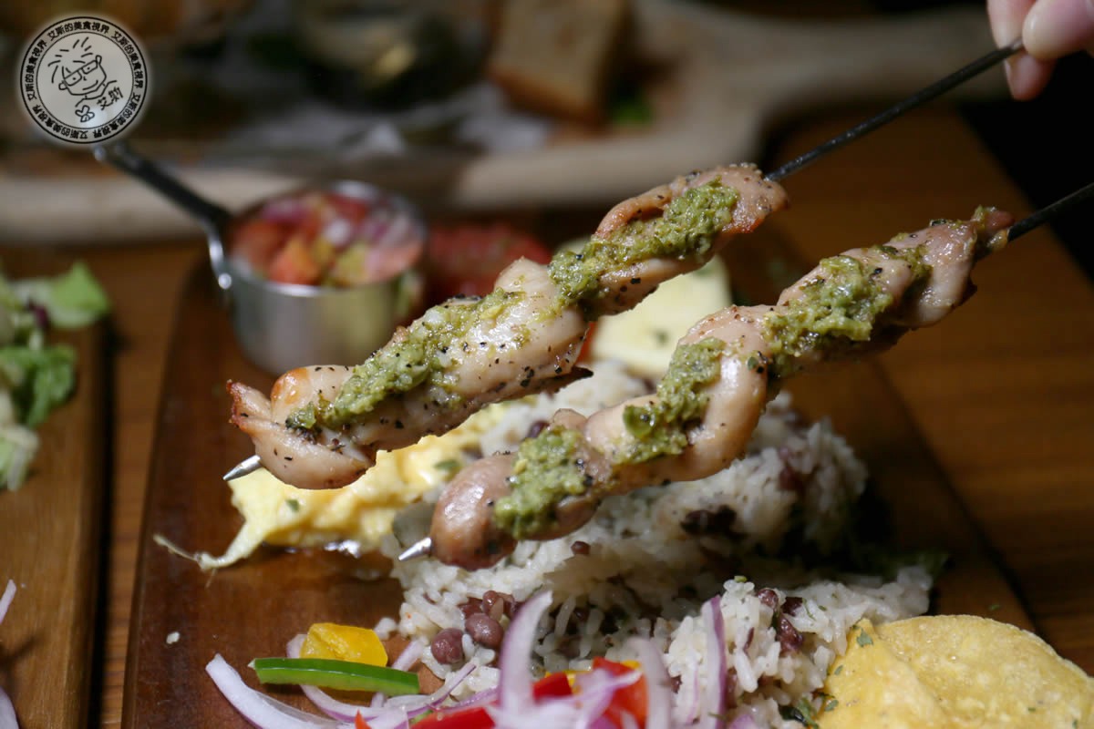 阿根廷青醬雞肉串香料豆飯(配有香料豆飯、炒蛋、玉米片、莎莎醬、凱薩沙拉)