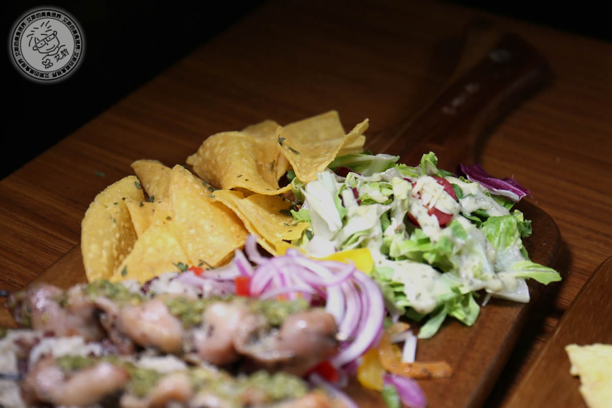 這道把原本的街頭法士達升級成鑄鐵鍋呈現,熱度加上鍋氣一上桌就香氣滿滿。豬肉與許多香料一起拌炒,酸甜微辣,超級開胃。搭配墨西哥餅皮可以自己包,加入酸奶油、酪梨醬、鹹豆泥與莎莎醬,每一種醬料都能帶來不同層次,酸奶油讓口感更清爽、酪梨增滑順、莎莎讓味覺更亮。旁邊的凱薩沙拉也能解膩。整體份量實在、吃法自由。