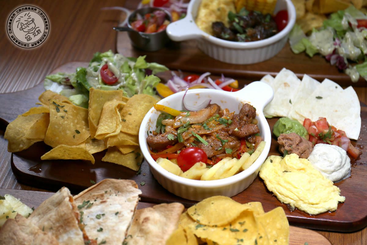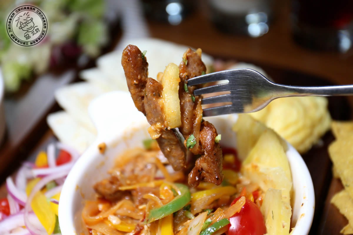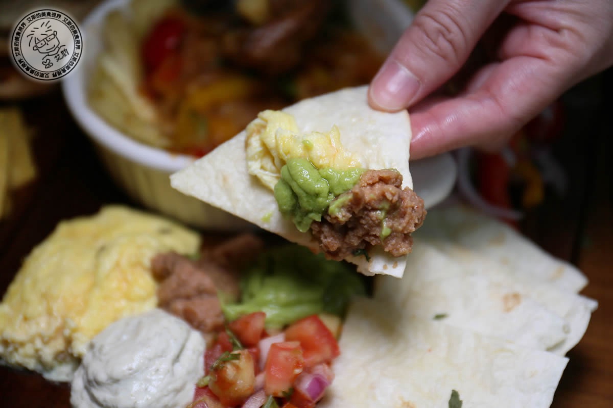 鐵板豬肉法士達早午餐(配有凱薩沙拉、墨西哥餅皮、酸奶油、鹹豆泥、酪梨醬、莎莎醬)