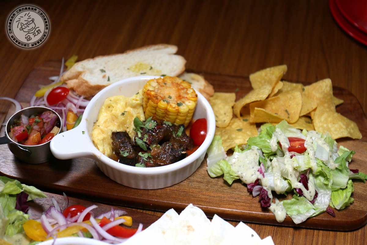 巴西燉牛臉頰肉早午餐(配有麵包、玉米片、凱薩沙拉、炒蛋、莎莎醬)