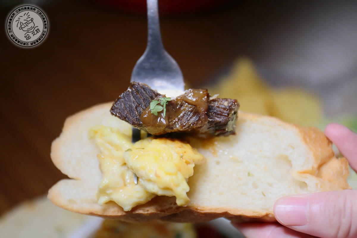 牛臉頰肉燉得超級軟嫩,幾乎不需要用力咀嚼就化開,醬汁帶點像紅燒牛肉麵紅燒牛肉的那種味道,但香料感更豐富,不管配麵包或玉米片都很不錯,配菜有炒蛋、莎莎醬、凱薩沙拉,莎莎的酸辣剛好中和牛肉的厚重。這道特別適合喜歡濃郁燉肉風味的人,吃完會有飽足感又覺得值回票價。