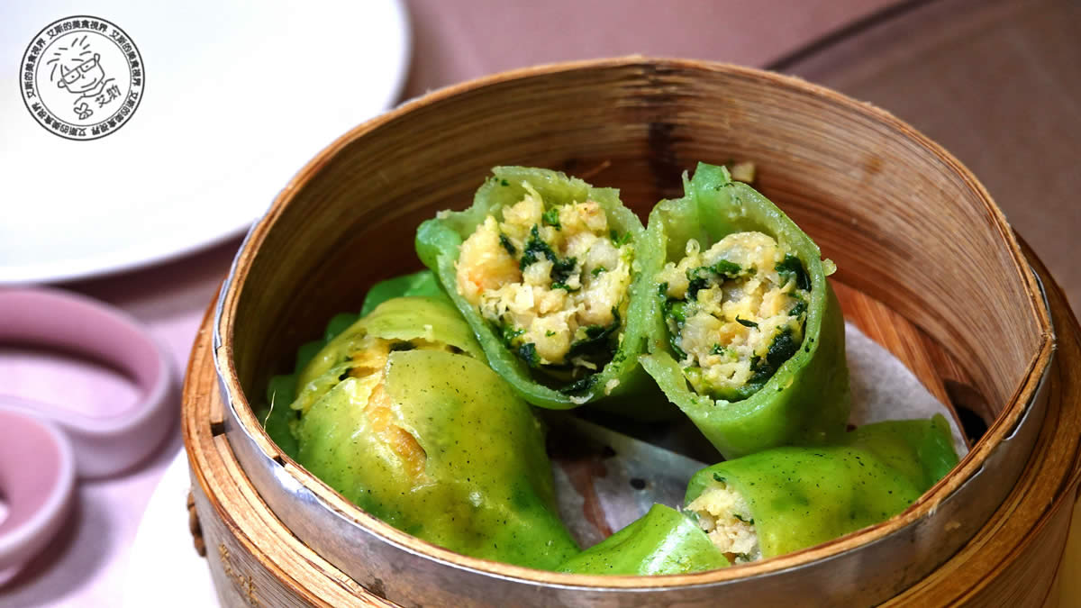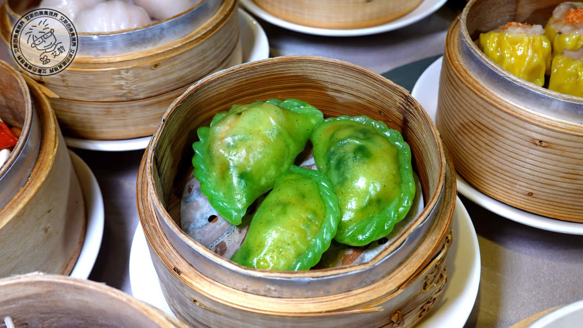 瑤柱豆苗餃:晶瑩帶綠色的外皮包裹著鮮嫩豆苗與頂級瑤柱。豆苗清甜平衡了海味鮮香,口感清脆細緻,是視覺與味覺雙重享受的精品級點心。