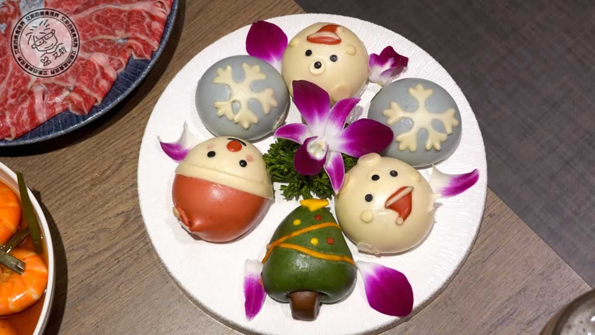 今天竟然有應景甜點,我們去的時候剛好是聖誕節前,他們師傅應該是自己做的聖誕包子,每個包子都非常可愛非常創新,而且裡面包的料都不同,有奶皇、豆沙跟芋頭三種,我剛好吃到芋頭口味,芋頭濃郁帶點顆粒很不錯吃;另外主廚甜點,白木耳熬煮之後加入冰糖,吃起來滑順清甜,真是完美的句點!