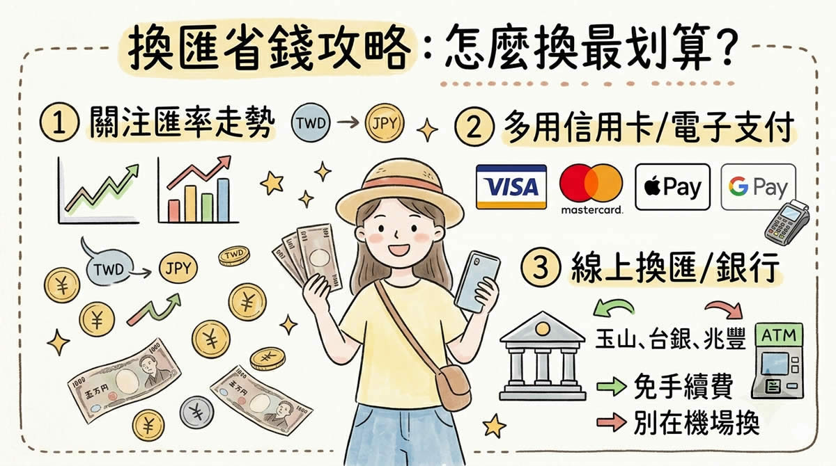 - 線上換匯/銀行提領: 使用銀行 APP 線上換匯通常有匯率優惠且免收手續費,再到機場或指定分行提領現鈔。