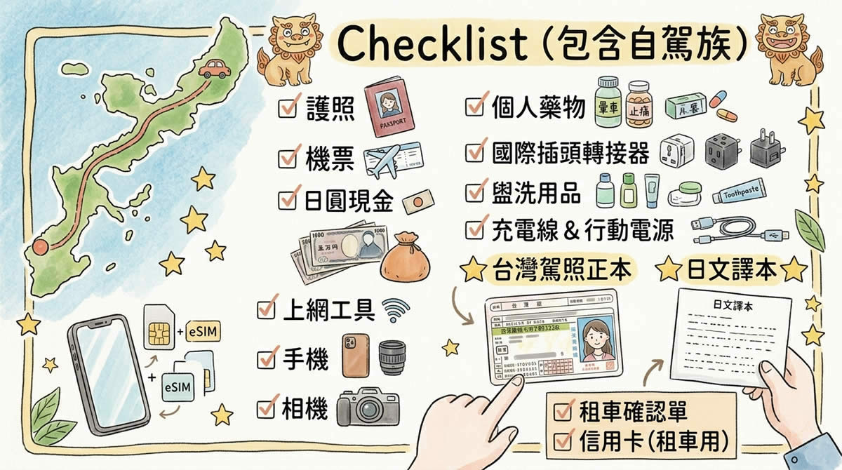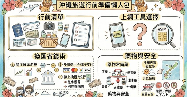終於要踏上這片碧藍島嶼了!說來慚愧,這是我人生第一次去沖繩,心情興奮之餘也帶點焦慮。為了讓這趟期待已久的旅行順利,我花了許多時間鑽研 沖繩行前準備 。畢竟這次還要挑戰第一次在日本自駕,想到要適應右駕就手心冒汗。這篇文與其說是分享,不如說是寫給自己的「行前備忘錄」,好提醒自己別漏掉最關鍵的證件與換匯細節。出發在即,希望這份紀錄能讓我的第一場沖繩冒險圓滿順利,啟動湛藍旅程!