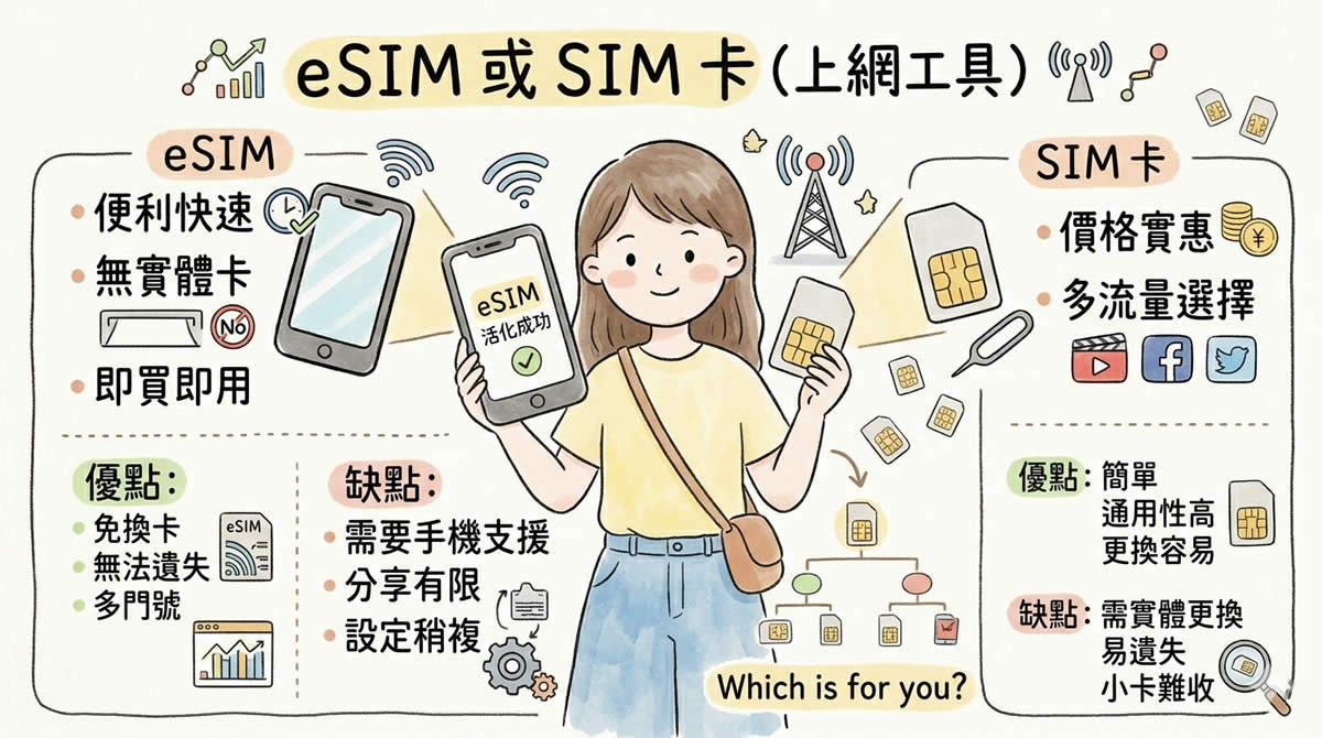 - 實體 SIM 卡: 價格親民、隨插即用、相容性最高,但要注意原台灣 SIM 卡的存放。