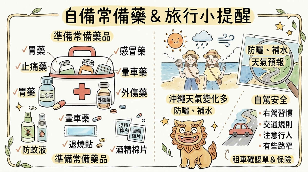 - 必備藥品: 胃藥、止痛藥(退燒用)、綜合感冒藥、暈車/暈船藥(離島行程必備)、外傷藥膏及防蚊液。