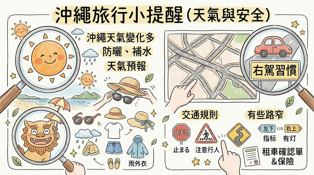 - 天氣預報: 沖繩氣候變化快,夏季注意防曬、補水;5-10 月為颱風季,建議隨時查看氣象並投保旅遊不便險。