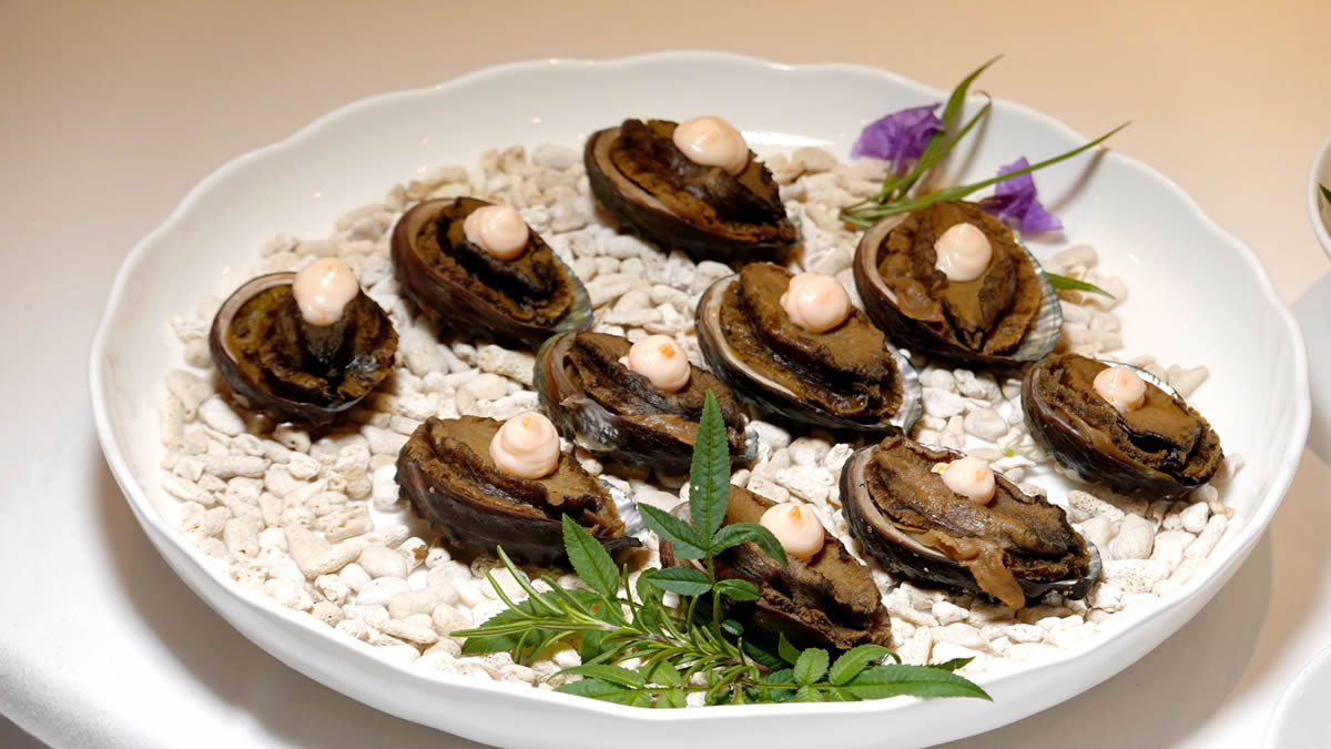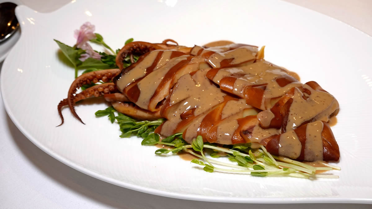一開始就展現了主廚深厚的功底。港式燒鴨皮脆肉嫩,油脂在舌尖化開的香氣令人陶醉;滋味九孔則以恰到好處的調味襯托出海鮮的鮮甜,口感彈牙;煙燻中卷帶有淡淡的木質香氣,層次分明;而香酥軟殼蟹炸得火候極佳,外酥內軟且完全不油膩。這四款截然不同的前菜,從冷盤到熱炸,完美地喚醒了味蕾,為後續的重頭戲做了最精采的鋪陳。