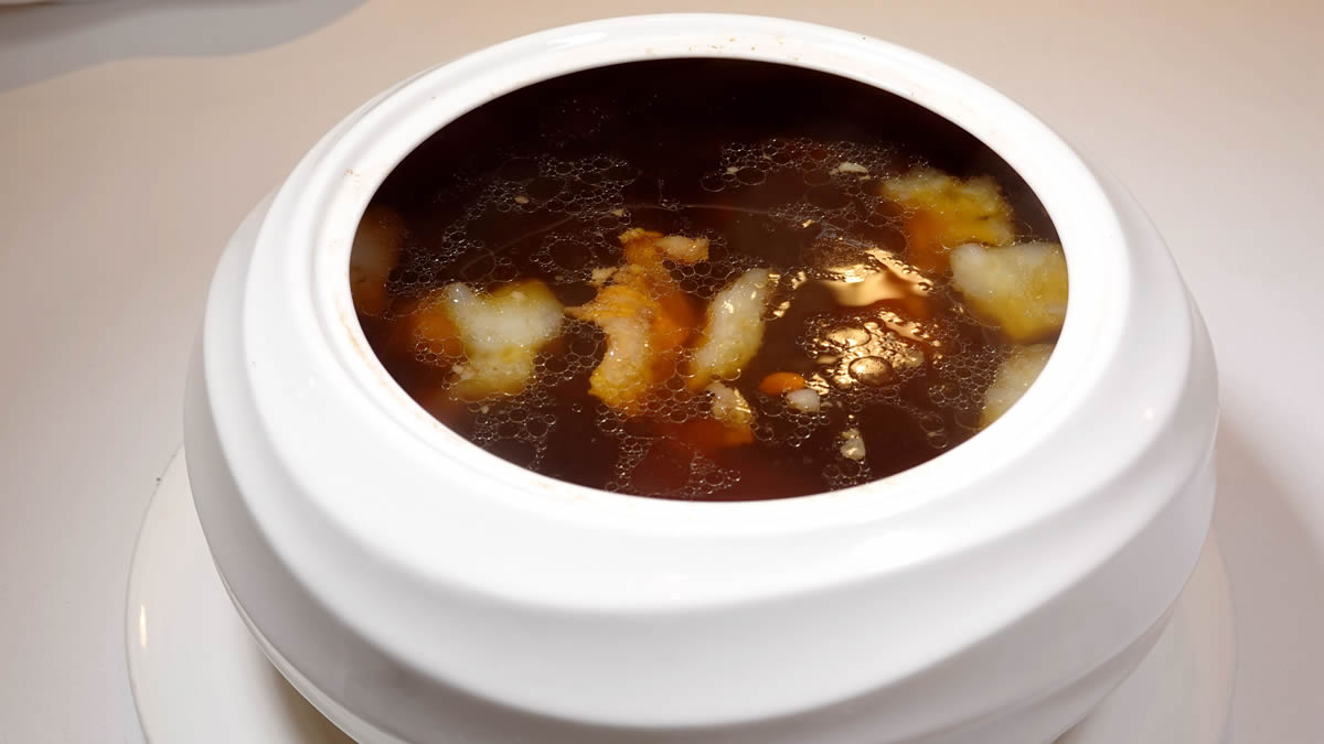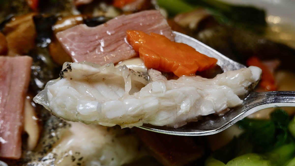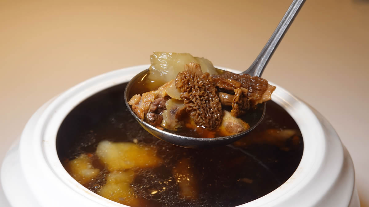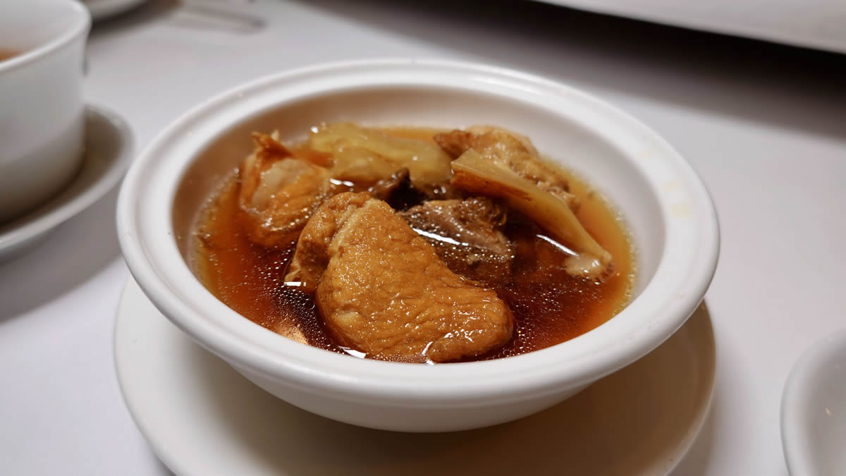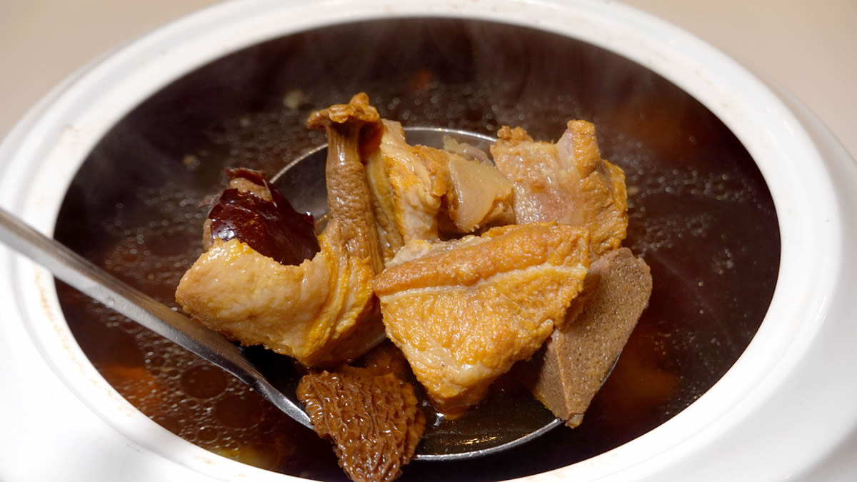 這道湯煲走的是溫潤路線,沒有過多油脂感。羊肚菌香氣細緻,肚膠滑順不腥,唐排燉得軟而不爛,湯頭清甜中帶著膠質的厚度。整體喝起來很舒服,是那種會讓人默默多喝幾口的湯品。放在宴席中段,剛好能平衡前面較重口味的菜色,也很適合長輩與需要滋補的聚餐場合。